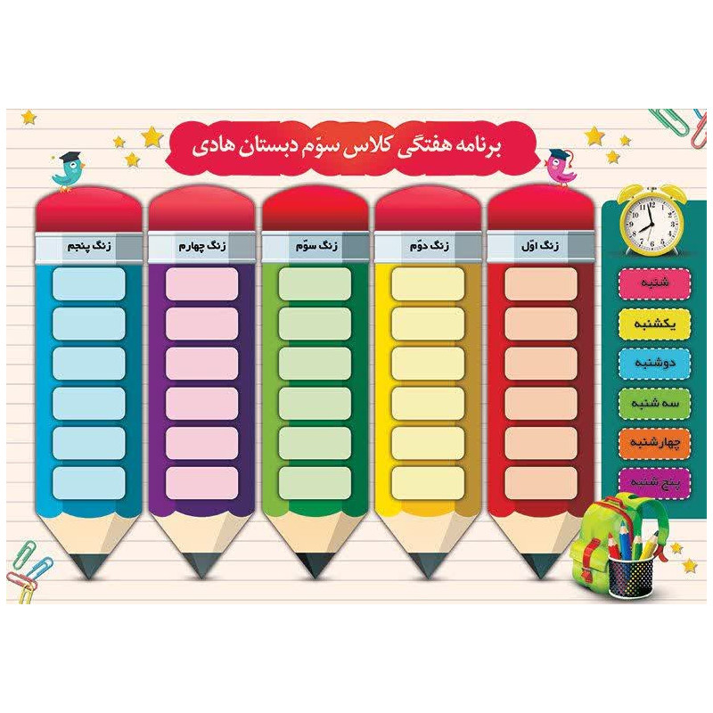 این برنامهی هفتگی با ظاهر لطیف و رنگهای آرامشبخش، محیطی شاد و منظم برای دانشآموزان فراهم میکند و به آنها کمک میکند با انگیزه و نظم بیشتری روزهای خود را سپری کنند