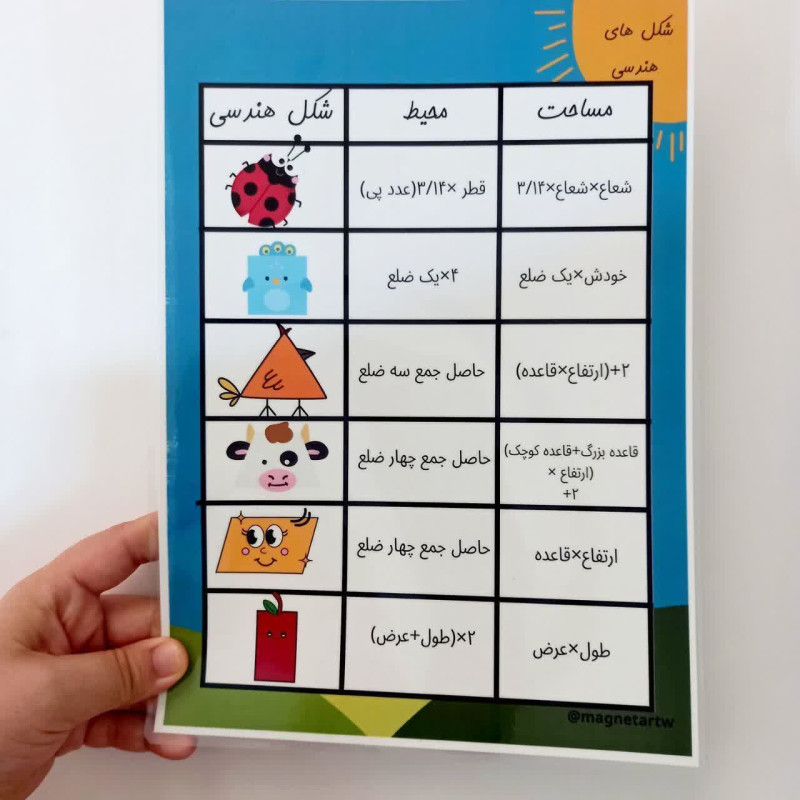 شامل فرمول‌های اشکال (دایره،مربع، مثلث، مستطیل،لوزی ، متوازی الاضلاع، ذوزنقه، مکعب مسطتیل)  می باشد